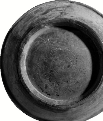 1935年的時(shí)候,考古學(xué)家何天行就在良渚發(fā)現(xiàn)過(guò)一個(gè)黑陶盤(pán),上面刻有十幾個(gè)符號(hào),經(jīng)過(guò)與甲骨文、金文中的符號(hào)對(duì)照、分析,發(fā)現(xiàn)其中7個(gè)符號(hào)在甲骨文中有同形字,3個(gè)在金文中有同形字。而在昨天展示的刻劃符號(hào)中,一個(gè)在卞家山出土的器物上的符號(hào),就與甲骨文中的“五”,很相似。