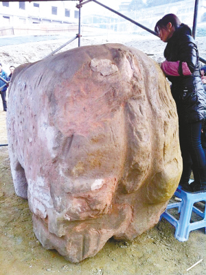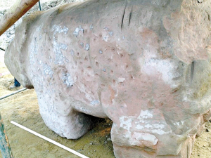昨日上午11點(diǎn)多,原本側(cè)身“躺”在地上的“石獸”在考古工作人員的幫助下重新“站”了起來。為了防止“石獸”翻身過程中出現(xiàn)損傷,工作人員還特別在其腰部圍上了厚棉被。究竟是犀是獅還是象?“站”直了的“石獸”仍讓大家難辨其身份。只見它身材高大,高約2米、長(zhǎng)3米多,據(jù)初步估計(jì),這個(gè)大家伙體重達(dá)到了8噸。值得一提的是,它整個(gè)頭部長(zhǎng)度幾乎有身長(zhǎng)的三分之二,因此,現(xiàn)場(chǎng)很多工作人員一時(shí)也說不清它到底是個(gè)什么動(dòng)物。