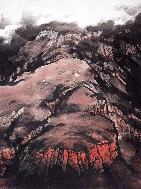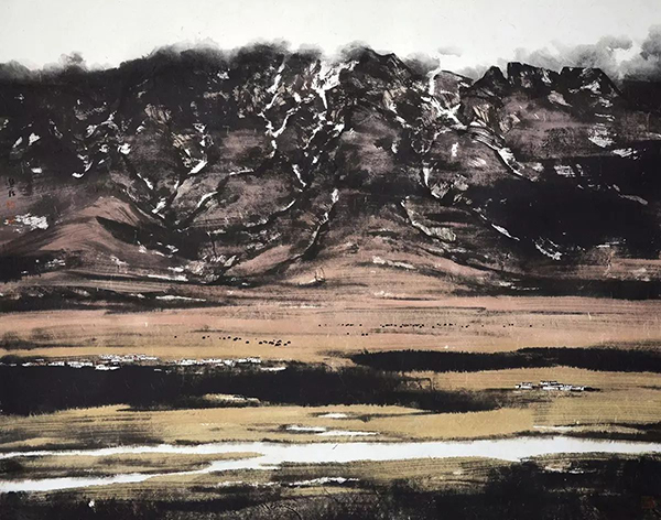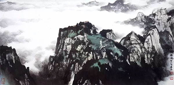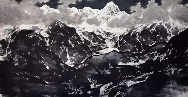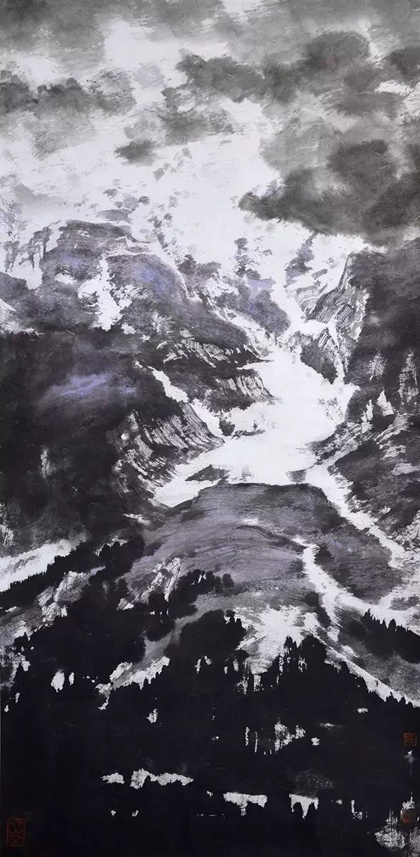 《高原的春天》、《神山圣水》、《高天厚土》、《萬水之源》、《阿里的秋天》、《西疆雪域》、《屹立》、《云橫雪嶺》等作品,厚重而充滿激情。應邀為中南海創(chuàng)作的《天開勝境》山峰連綿壯麗,云霧悠然環(huán)繞,筆法簡單卻生機盎然,筆墨松弛但布局壯觀。遠古的青綠帶著現代的急速感成為畫作的主色調,整個畫面洋溢著新時代太平盛世的和諧景象。