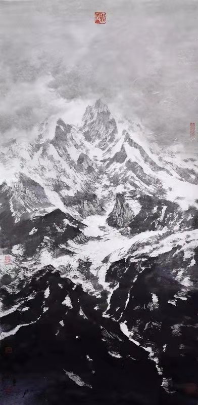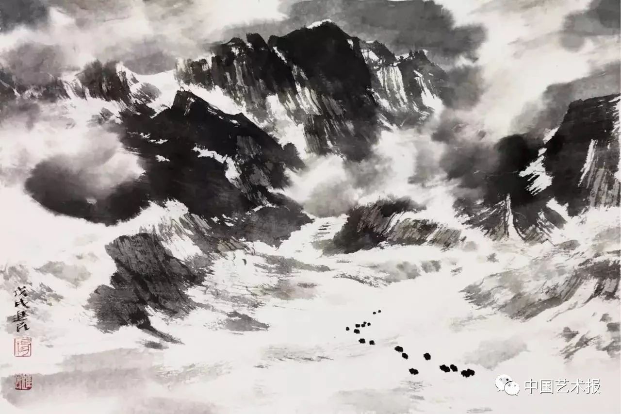 如何畫出西藏大氣磅礴的自然之景,并融入畫者的獨(dú)特感受?楊進(jìn)民坦言,“這是一個(gè)全新的課題”。西藏景色多為大面積的塊面結(jié)構(gòu),色彩絢麗飽滿,明暗對(duì)比強(qiáng)烈,如果采用以線造型、水墨渲染的傳統(tǒng)方法,則會(huì)“水土不服”。經(jīng)過不斷嘗試和摸索,楊進(jìn)民終于找到了新的路徑。他說:“我試著把毛筆和板刷并用,結(jié)合中國畫的線條和西方繪畫的塊面,融合前者的主觀寫意性和后者的客觀寫實(shí)性,還吸收了其他藝術(shù)形式的有益成分,力求創(chuàng)造一種既非完全中國的、又非完全西方的,既區(qū)別于傳統(tǒng)、又區(qū)別于他人的獨(dú)特形式。”