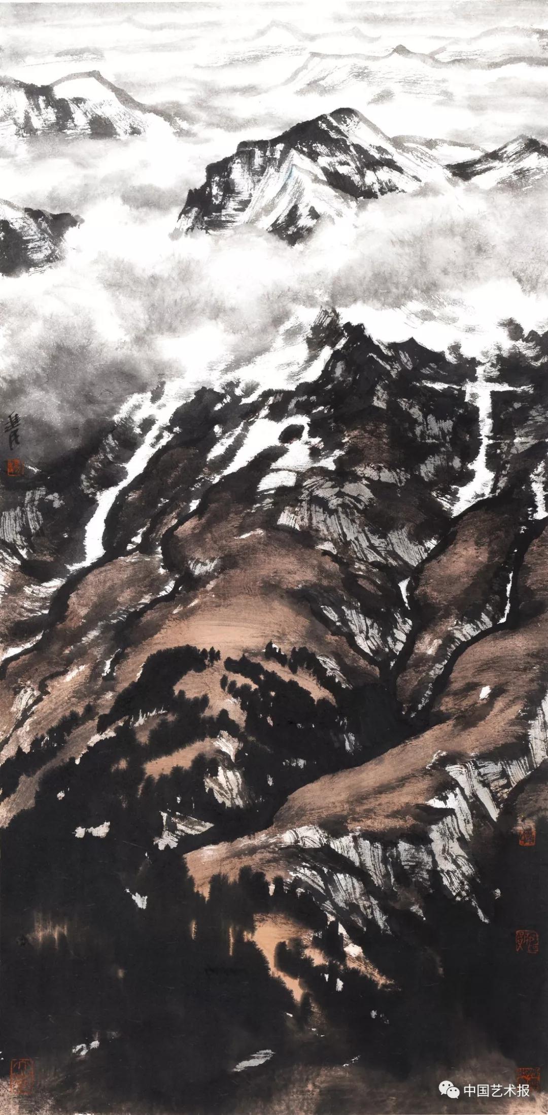 觀楊進(jìn)民《阿里的秋天》《喜馬拉雅》《岷山千里雪》等作,富于寫意氣質(zhì),自然的壯美之“勢(shì)”充盈紙上。實(shí)際上,作品里流露的生命精神往往最直觀、最本質(zhì)。畫中西藏山水的宏大氣象,正是楊進(jìn)民藝術(shù)獨(dú)創(chuàng)性和廣闊心境的有力印證。