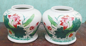 將軍罐上“紅蓮醉”。這對(duì)民國(guó)年間的五彩將軍罐高13厘米,口徑6厘米,腹徑15厘米,底徑9厘米,描繪的正是紅蓮盛開(kāi)的情形。如果說(shuō)上面的冬瓜罐上描繪的是一幅水墨畫(huà),那么這只將軍罐上便是一幅水彩畫(huà)。只見(jiàn)荷葉青翠欲滴,荷花紅艷醉人,水草寥寥幾筆,空山幽谷之間,一派超凡脫俗的景致。民國(guó)時(shí)油畫(huà)已經(jīng)引入中國(guó),這只將軍罐顯然借鑒了油畫(huà)的繪畫(huà)技巧,使得罐上的荷花真實(shí)、動(dòng)人,非水墨畫(huà)那般寫(xiě)意。