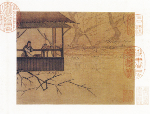 馬逵的《賞梅圖》利用了南宋朝廷特制的雙拼細絹,質(zhì)地精良,著色不洇不染。這幅繪畫作品的構(gòu)圖有別于馬遠的《梅石溪鳧圖》。從畫面的平衡度來說,要容易掌握一些。它的巧妙之處,在于左側(cè)的亭閣,墨色濃重,線條規(guī)整。而對岸的梅樹著墨淡然,產(chǎn)生朦朧之感,枝條的形態(tài)與亭閣一致,少有曲折變化。梅花隱隱約約,有暗香浮動,隨風飄然。亭閣的前方恰好有橫逸的梅枝,清瘦,雅致,搖曳生姿。伏欄長者目光游離,甚或飄忽,倏地聞到梅花的清香,精神為之一振,視野即刻豁然,繼而怡然自得——凡塵未盡,詩意又生,人生就是如此反復。這是親水一族,不畏嚴寒,以待春風洗塵、春雨淋漓,恰如明代侍讀學士王達為該畫配詩所云:“西湖水涵冰色炯,眾鳥不喧人更靜。孤山堂下雪初銷,一泓冷浸梅花影。”