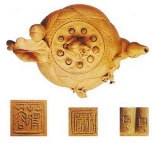 我輕輕掀起壺蓋兒,心不由得“砰砰”狂跳起來,一枚方方正正的“蔣蓉”印章映入我的眼簾。我趕緊再去看那長流和壺的底部,哇!都有蔣蓉的印章。名家蔣蓉的作品!一時把我激動得不得了。同時,我的大腦也在飛快地轉(zhuǎn)動,拼命琢磨該怎樣讓大娘將它轉(zhuǎn)讓給我。