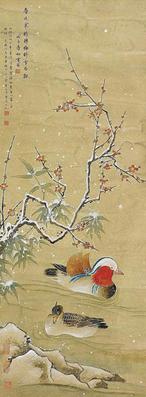 這幅筆法兼工帶寫的《雪里鴛鴦》,創(chuàng)作于1948年。背景穿插著幾枝疏朗的紅梅,樹上的積雪和漫天飄舞的雪花充滿著寒意,樹下一對羽色鮮艷華麗的鴛鴦?dòng)迫唤Y(jié)伴,游于岸邊。整個(gè)畫面安詳靜謐、意境幽遠(yuǎn),神接宋人,無一絲煙火之氣,深刻地表達(dá)出“濃香殘?jiān)铝岘囉?rdquo;的動(dòng)人詩意,于蕭肅中透出淡淡的春之信息?钭R(shí)為“春近寒雖轉(zhuǎn),梅舒雪尚飄。戊子春初,雪翁。此幀系戊子年舊作,寫春寒雖勁,春意已露之意。”細(xì)品此畫,景物雖不繁雜,但主次分明、動(dòng)靜相應(yīng)、虛實(shí)相生,于平淡中彰顯出獨(dú)特的韻味。