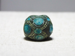 我市藏家“子君”手中就有一枚價(jià)值不菲的戰(zhàn)國(guó)蜻蜓眼。其呈不規(guī)則的類形球,直徑約2.3厘米,9個(gè)復(fù)眼9個(gè)小眼,加之星條紋飾,非常漂亮。難得的是,胎是綠的,眼是藍(lán)的,較為少見(jiàn)。