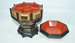 桌盒的材質(zhì)有金屬、藤編、竹木、瓷、琺瑯、漆器多種,薈集了彩繪、彩釉、上漆、雕刻、螺鈿、描金等多項傳統(tǒng)技法。其造型多為扁圓形、梅花形或八角形,大小如簸箕,上有盒蓋,盒內(nèi)分成多格,也有盒內(nèi)配備多個小瓷碟的制品。部分精巧的桌盒,還配設有底座,盒子、格盤,可與底座拆分開來,以便于清潔。盒內(nèi)通常有七個格子,少則五格,中間的格子為圓形,環(huán)繞的一圈格子為扇形,用以分裝各式蜜餞糖果、糕點小食。桌盒除了年節(jié)用來款待客人,在日常的人情往來中,也是送禮饋贈的華麗容器!督鹌棵贰返18回:“西門慶新蓋卷棚上梁,親友掛紅慶賀,遞果盒的也有許多。”作為一種文化消費品,桌盒很早就進入了人們的日常生活,成為了傳遞福樂的櫥窗。