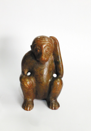 這只玉猴,雙目圓睜,一手捂耳,一手垂于膝下,正是一副抓耳撓腮的靈猴模樣。據(jù)專家介紹,制作這只玉猴的材質(zhì)并不名貴,不是“血統(tǒng)”高貴的新疆和田玉,而是地方玉。但從遍布玉表的橘皮及深入玉肌的沁色來看,這只玉猴是很有些年代的老東西。