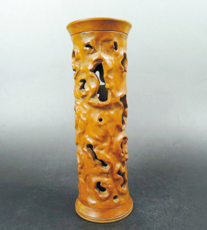 不了解的人會將香筒誤認為是盛放根香用的,其實不然。在古代,根香較少,那時多為香料,而盛放香料的另有器具,便是香盒。香筒類似于香薰,主要用來盛放香料或者香味比較濃厚的花朵。因此,香筒一般為鏤空雕,這樣一來,香氣便可以通過孔洞飄散出來,使得室內(nèi)芬芳馥郁,香氣撲鼻,起到凈化空氣的效果。褚松窗在《竹刻脞語》中說:“圓徑相同,長七八寸者,用檀木作底蓋,以銅作膽,刻山水人物,地鏤空,置名香于內(nèi)焚之,香氣噴溢,置書案間或衾枕旁,補香篝之不足,名曰香筒。”看來,內(nèi)中的香料也是可以點燃的,這就和香薰的功用一般了。當(dāng)然,對于圖中這只香筒來說,其應(yīng)該是用來盛放成塊的香料和整朵的鮮花的,如果香料太過細小,估計會灑出筒外。