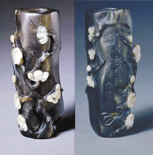此筆插高11.4厘米,口徑4.2厘米,底徑3.8厘米,口微敞。用料為產(chǎn)于新疆的茶晶。因茶晶上有白斑,玉工巧妙地將其琢成白梅,是冰晶器中難得的俏色之作。筆插另一面琢兩行行書“疏影橫斜 暗香浮動”八字。末署圓形“子”、方形“岡”陰文二印,充滿了文人畫韻味,格調(diào)高雅,技藝不凡。“子岡”指明代玉雕大師陸子岡。陸子岡是明末最為著名的琢玉巨匠,在許多文人筆記中都有記載,《蘇州府志》載:“陸子岡,碾玉錄牧,造水仙簪,玲瓏奇巧,花莖細(xì)如毫發(fā)。”徐渭詠水仙簪》:“略有風(fēng)情陳妙常,絕無煙火杜蘭香。昆吾峰盡終南似,愁釘蘇州陸子岡。”直到今天,刻有陸子岡款的玉器仍有許多流傳于世。傳說陸子岡有次在為皇上制作一件玉雕后,將自己的名字刻在了龍頭紋路上,觸怒了皇帝,不幸被殺。陸子岡英年早逝,沒有后代,一身絕技隨之湮滅。但他的作品青玉山水人物玉盒、青玉嬰戲紋執(zhí)壺等與這款茶晶梅花花插被收藏在北京故宮、首都博物館、上海博物館、天津藝術(shù)博物館等地,成為傳世杰作。