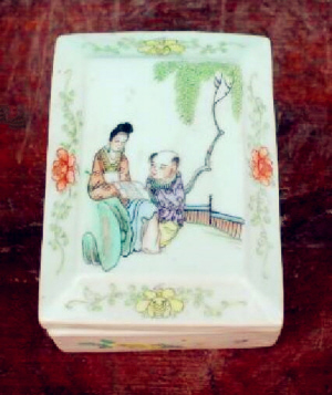 此印泥盒呈四方形,長(zhǎng)12厘米,寬8.5厘米,高5厘米。印泥盒四面繪滿(mǎn)了各種花卉,而盒蓋上則是一幅春光明媚的讀書(shū)圖。只見(jiàn)畫(huà)面中矮矮的圍墻里,一棵彎曲的柳樹(shù),枝繁葉茂,春意盎然。一位年輕貌美的少婦,正坐在柳樹(shù)下,雙膝上放著一卷詩(shī)書(shū),右邊坐著一名孩童,正在閱讀少婦膝蓋上的詩(shī)書(shū):母親循循善誘,孩童專(zhuān)心致志。他們希望有一天金榜題名,光宗耀祖。看情形,這大概是在早春季節(jié),天氣微寒,孩童和少婦的雙手都蜷縮在袖子里。這幅母子讀書(shū)的動(dòng)人場(chǎng)景,讓人難忘。盒蓋的四周,是在綠葉陪襯下的粉紅和黃色的花朵,顯得漂亮大方。該印泥盒色彩清雅,畫(huà)工細(xì)膩,瓷質(zhì)白細(xì),釉面潤(rùn)澤,造型規(guī)整。