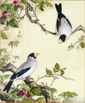 清代畫家郎世寧的《櫻桃圖》,亦于葉綠果紅的櫻桃枝頭,添畫一對鳥兒點綴。此畫設(shè)色,絹本,縱33.3厘米,橫27.8厘米,現(xiàn)收藏于臺北故宮博物院。