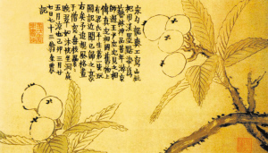 清代畫壇“揚州八怪”之首的金農(nóng),有多幅枇杷圖傳世,均為其晚年作品。金農(nóng)是中國典型文人畫的代表,畫幅上一般都有自撰的題跋。重慶三峽博物館藏《枇杷圖軸》,是作者76歲時的作品,為紙本設(shè)色,縱123厘米,橫27厘米。圖繪枇杷一枝,碩果累累。筆法古拙,質(zhì)樸蒼老。左上有跋語:“橛頭船,昨日到,洞庭枇杷天下少,額黃顏色真?zhèn)好,我與山妻同一飽。”由跋語可知,枇杷是金農(nóng)比較喜歡吃的水果。
