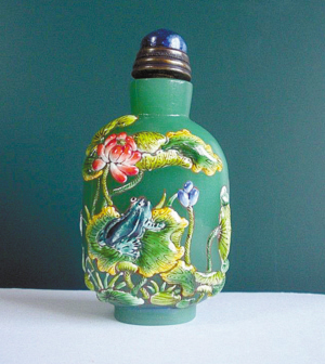 正中心的一片荷葉上,趴著一只深綠色的青蛙,它表現(xiàn)出很俏皮的樣子,眼神乖乖的,好奇地張望著四周的風(fēng)景,那神情,就像是一個(gè)無(wú)憂無(wú)慮、天真可愛(ài)的孩童?磥(lái),古人用蛙指代娃,倒也恰如其分。在鼻煙壺的底部,有“乾隆年制”字樣,不甚工整,但其雕刻水平已入化境,妙手雕琢,便成絕唱。