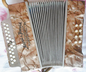 我最喜愛的手風(fēng)琴是一架德國產(chǎn)的老手風(fēng)琴。它長30厘米,寬14厘米,高28厘米,上面有1918年、1942年的標(biāo)識和一個二戰(zhàn)納粹“鷹”徽。這是一架經(jīng)歷過一戰(zhàn)和二戰(zhàn)的德國老手風(fēng)琴,我簡單查了下上面的單詞,大概是“萊茵河畔”“巴伐利亞啤酒館”之類的詞意,由于年代久遠(yuǎn),上面少個鈕,但保存至今已屬難得。這架老式手風(fēng)琴音質(zhì)純美、音域?qū)拸V,我常常輕輕拉動折疊的風(fēng)箱,奏上一首《莫斯科郊外的晚上》,優(yōu)美旋律從我的指尖流淌,在房間肆意跳躍。