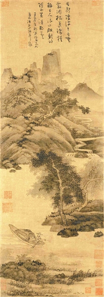 吳鎮(zhèn)的畫(huà),多得董源和巨然之法,清代著名畫(huà)家吳歷評(píng)論說(shuō):“梅道人法巨然,筆下清雄奇富,變態(tài)無(wú)窮,出新意于法度之中,寄妙理于豪放之外。”這幅畫(huà)面上,未作雄偉高峻的山巒,而是董源式的江南溪山。但見(jiàn)群山聳峙,遠(yuǎn)岫在山嵐霧靄之中若隱若現(xiàn),秋日里楓葉染丹,近處的小洲上有兩棵欹斜的老樹(shù),頭戴斗笠的漁父悠然自得地坐在船頭垂釣,艙中的酒葫蘆平添了他的幾分醉意,似在醞釀著收獲后的滿(mǎn)船漁歌,大有“小舟從此逝,江海寄余生”的飄逸豁達(dá),讓人想起莊子的“巧者勞而智者憂(yōu),無(wú)能為者無(wú)所求,蔬食而遨游,泛若不系之舟”的超脫,真可謂瀟灑出塵、自得逸趣。