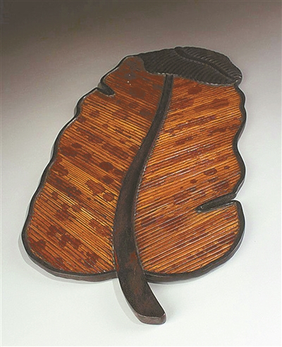 我收藏一把產(chǎn)于清朝的“芭蕉扇”。其實不是,它只是一個茶盤,做成了芭蕉扇的形狀而已,它長40.3厘米,寬21.5厘米,厚2.6厘米,整體輪廓為紅木所制,而其中的鑲嵌為湘妃竹,然后就成了一把惟妙惟肖的芭蕉扇。由于年代久遠,紅木已經(jīng)呈現(xiàn)深黑狀,宛如無限的歷史過往在其身上碾過一般,而湘妃竹也呈現(xiàn)黃褐色,上面宛若淚痕的斑斑點點訴說著那些還不算久遠的故事,使得這件蕉葉狀茶盤看起來既古樸又滄桑。