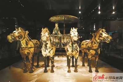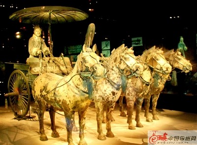 現(xiàn)藏于陜西西安秦始皇陵博物院的秦始皇陵銅車馬,于1981年出土,共兩輛,是目前發(fā)現(xiàn)年代最早、形體最大、保存最完整的銅鑄車馬。車通長3.17米,高1.06米,相當于真車馬的一半;總重量為1241公斤,由大小3462個零部件組裝而成,其中青銅制件1742個,黃金制件737個,白銀制件983個。其形體之大,堪稱“青銅之冠”,此物對研究中國古代車馬制度、雕刻藝術(shù)和冶煉技術(shù)等,都具有極其重要的歷史價值。看兵馬俑時,千萬別錯過這對銅車馬,保證會讓你很震撼,現(xiàn)在的奔馳寶馬,在當時也沒它氣派!