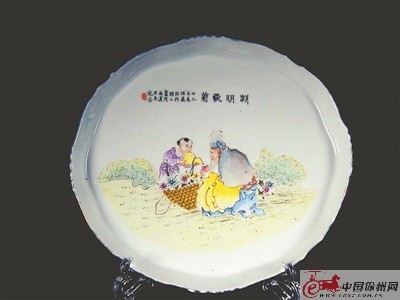 粉彩茶盤。在《飲酒·其七》中,陶淵明曾這樣寫道:“秋菊有佳色,裛露掇其英。泛此忘憂物,遠(yuǎn)我遺世情。一觴雖獨進(jìn),杯盡壺自傾。日入群動息,歸鳥趨林鳴。嘯傲東軒下,聊復(fù)得此生。”估計,在陶淵明看來,這世間唯有菊花與美酒能夠讓他流連忘返,在山野鄉(xiāng)間樂不思蜀了。這只民國時期的粉彩茶盤便描繪了這樣一幅場景,其為橢圓形,略顯不規(guī)則,盤內(nèi)底部繪隱約青山,蕭瑟叢林,枯黃草地,陶淵明的面前是一大筐菊花,他端著杯子,一個童子正用一只葫蘆倒著水?磥聿删帐莻體力活,詩人有些累了,坐下來喝口水。