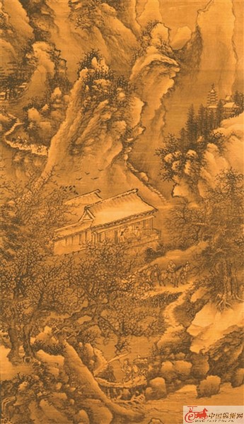 這幅畫的構(gòu)圖取材于唐代詩人岑參“卷簾山對酒,上馬雪沾衣”詩意。畫面中雪山連綿巍峨,寒林疏密有致,棧道回環(huán)曲折。寒鴉集樹,雪花飛舞。遠處逶迤的山道上,有三兩旅人,或挑擔,或騎馬,冒雪趕路。中間一處庭院,屋中數(shù)人卷簾圍坐,一邊暢飲,一邊賞雪。屋前一群人,停步不前,似乎在商討行進路線。畫面最近處,有一人牽馬打傘,小心翼翼地通過一段危險的山徑。整幅畫同樣將山水的磅礴大氣與人物的生動精微合二為一,令人嘆為觀止。