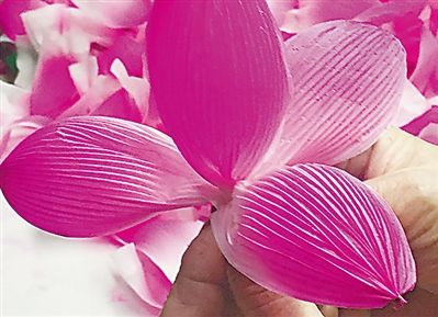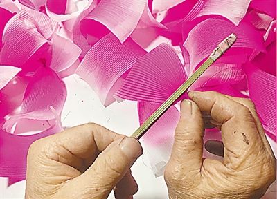 下一個步驟也十分關鍵,就是扎花瓣。粉色的花瓣、綠色的葉子,怎樣才能栩栩如生?曹真榮介紹,首先是將白色的拷貝紙,剪成豆腐塊一樣大小,500張或1000張一起,浸泡在顏料水的染缸中。“具體浸泡時間,根據(jù)制作者對顏色深度效果的需要來確定,一般兩三分鐘即可。”曹真榮告訴記者,泡好后要晾干,而這也講究,只能陰干、不能曬干。一般來說,春夏之交的黃梅雨季不能晾曬,否則容易發(fā)霉;夏季蒸發(fā)快,適合大批量晾曬,但紫外線照射又容易褪色;秋冬季節(jié)氣候干燥,比較適宜。
