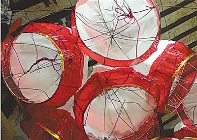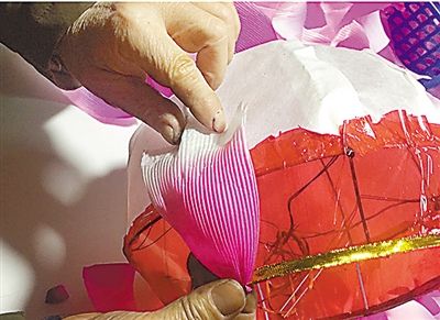 為了體現(xiàn)出立體、半浮雕的效果,扎花瓣時要先進行卷曲,然后用膠水黏貼在框子上。不同的燈,大小不一、層次不一,花瓣的片數(shù)也不同。一般來說,小的有30張、中等的40至50張,大型的需要7層56張。