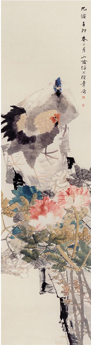 清 任伯年 牡丹雙雞圖 148.5×39.8cm 1891年 紙本