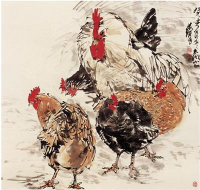 在繪畫中,“雞”是歷代畫家樂此不疲的重要題材。至少從宋代開始,便有以“雞”為主題的繪畫流傳于世。直到今天,在畫家筆下,仍然可以見到各種雄姿英發(fā)的“雞”的形象。就其原因,不外乎在傳統(tǒng)文化中,“雞”承載著很多的吉祥寓意。早在漢代,韓嬰便在《韓詩外傳》中提出“雞有五德”之說。所謂“五德”,是指文、武、勇、仁、信:因頭戴冠者,所以稱為“文”,有“升官”和獲取功名之喻;足搏距者,稱為“武”,公雞成為武將的象征;敵在前而敢斗,稱為“勇”,如《斗雞圖》即屬此例;見食相呼者,稱為“仁”;守夜不失時者,稱為“信”,俗語有“天雞報曉天下知”之說。若人能具備此“五德”,便是幾近于完人了。所以作為長盛不衰的畫題,“雞”寄托著人們的美好期許。當(dāng)然,“雞”本身與“吉”諧音,故有“大吉”、“吉祥”之義,F(xiàn)代很多畫家如陳大羽等經(jīng)常便以大公雞為題創(chuàng)作《大吉圖》,就是取其諧音。