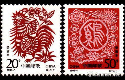 據(jù)了解,《癸酉年》雞年郵票含一枚圖案與一枚文字。第一枚票圖為“雄雞報曉”,白底上面是一只昂首挺胸引頸高歌的大紅公雞,線條有柔婉有粗獷,邊角以花草加以修飾。第二枚為“四季吉祥”,以紅底襯托出白色線條圖,畫面中心是篆體“雞”字,篆字“雞”在造型和線條處理上,大膽運用剪紙一書中夸張、變形、移位等綜合手法,使得一個簡單的雞字耐人尋味。字的四周還有菊花、梅花等花卉環(huán)繞,寓意長壽、祥和。