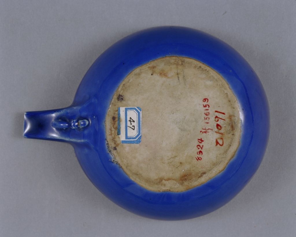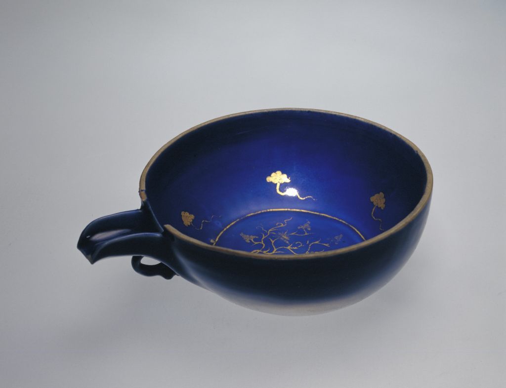 匜(yí 音儀)敞口,淺弧腹,平底?谝粋(cè)出槽形流,流下置一小系。胎較薄。內(nèi)外施藍(lán)釉,釉厚而不均勻?谶吅屯獾谉o(wú)釉。內(nèi)底描金線圈內(nèi)繪金彩折枝花紋,內(nèi)壁畫5朵金彩祥云。