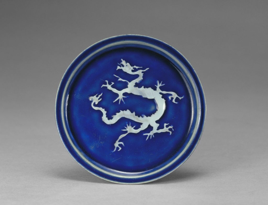盤折沿,淺壁,平底。通體內(nèi)外施藍(lán)釉,外底無(wú)釉。盤心坦平,在藍(lán)釉地上以白色泥料塑貼一條矯健的白龍。龍細(xì)頸,三爪,作昂首翻騰狀。