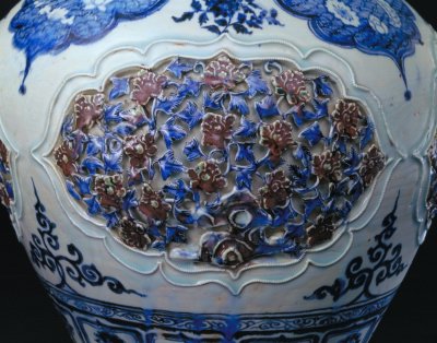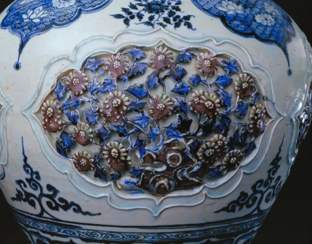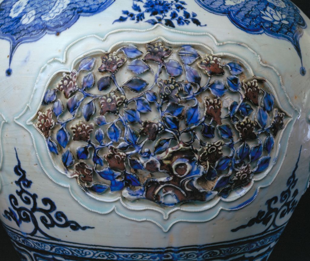 此罐1965年出土于河北省保定市元代窖藏(參見河北省博物館:《保定市發(fā)現(xiàn)一批元代瓷器》,《文物》1965年第2期)。造型豐滿渾厚,紋飾層次鮮明,綜合了繪、鏤、塑、貼等多種技法,特別是鏤花裝飾在元代瓷器上較少見。青花、釉里紅在作品中互為襯托,紅、藍(lán)交相輝映,整體形成一種氣度雍容而又花團(tuán)錦簇的藝術(shù)效果。