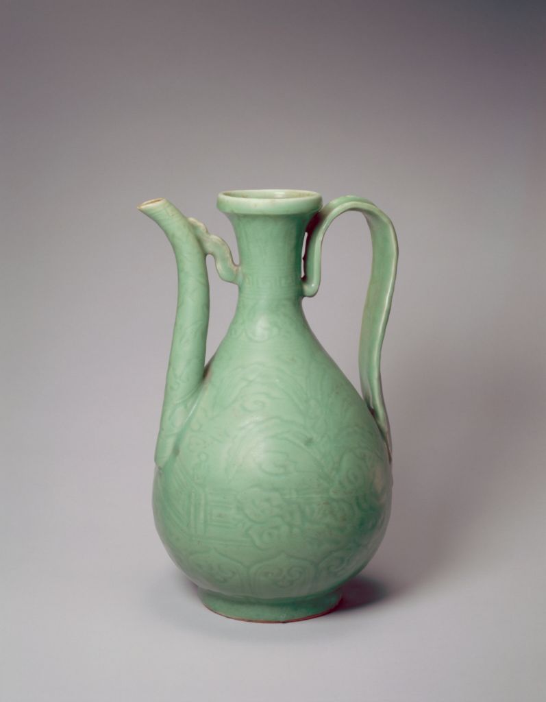 龍泉窯青釉執(zhí)壺,元,高25cm,口徑4.5cm,足徑3cm。