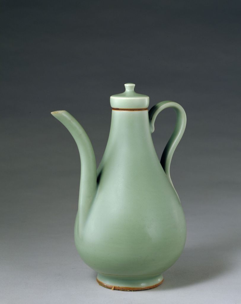 執(zhí)壺直口,口下漸豐,垂腹,圈足微外撇。壺一側(cè)置長(zhǎng)流,相對(duì)一側(cè)置曲柄。附平頂圓紐蓋?凇⒆氵吢短。通體施青釉。