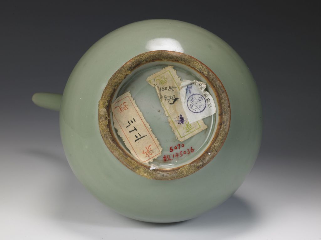 此執(zhí)壺上瘦下豐,線條流暢,收放適度,造型優(yōu)美。其釉面勻凈,釉色粉青,美若天然古玉。