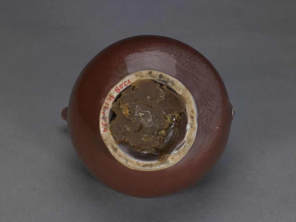 壺體呈梨形,直口,口以下漸豐成下垂的圓腹,腹部一側(cè)置彎流,另一側(cè)置曲柄,圈足較高微外撇,無(wú)款。附傘形蓋,蓋頂置寶珠形紐,蓋一側(cè)及壺口沿外側(cè)各置一個(gè)小圓環(huán)系,以便系繩連接,防止壺蓋脫落。通體滿施紅釉,腹部暗刻五爪云龍紋。