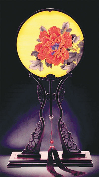 團(tuán)扇的扇形變化多端,在歷代發(fā)展中演化出了銅鏡式、宮燈式、金鐘式、鐘離式、雞心式、鳳尾式、龍球式、海棠式、玉佩式、黑花式、六角式等豐富的樣態(tài)。盛春創(chuàng)作的《鳳梧牡丹》是桐葉式扇形,輔以緙絲扇面,扇頂部為銅鍍金護(hù)頂,下部為花形護(hù)托,以紫檀木制扇柄,嵌壽字銀絲。鳳棲梧桐之上,頭向牡丹,花開(kāi)富貴,佐以香包點(diǎn)綴,一扇輕搖而香風(fēng)翩至!痘☉虻窞榘沤妒剑蠌V下狹,上端翹起,使扇面呈立體弧度。扇框以宋錦包邊,彰顯華麗姿態(tài)。扇面藍(lán)地上緙織折枝牡丹花及蝴蝶圖案,依畫(huà)理鋪排,花葉絢麗多姿,清秀中不失奢華氣度。《花好月圓》為紫光檀木圓形扇框,扇框上下襯以福紋尾花,配以牡丹緙絲扇面,明艷華美,傳遞出美好的祝福。