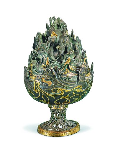 一件錯(cuò)金銅博山爐,就足以體現(xiàn)當(dāng)時(shí)國力之強(qiáng)盛。“博山”即漢代升仙信仰中的仙山,博山爐是專指仙山造型的熏爐。“錯(cuò)金”是指它的工藝——其通體的云氣紋是用金絲和金片鑲嵌而成。爐身分為爐座、爐盤、爐蓋三部分。爐座透雕成三龍出水的樣子;爐盤上部和爐蓋鑄成高低起伏的山巒;爐蓋上還因山勢(shì)鏤孔,雕塑出生動(dòng)的山間景色:神獸出沒、虎豹奔走、小猴嬉戲、獵人巡獵山間。專家說,這件只有26厘米高的熏爐,匯合了仙山、大海、神龍、異獸等多種元素,體現(xiàn)了大漢王朝“包舉宇內(nèi),囊括四海”的胸懷與氣度。