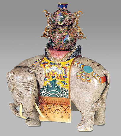 象作回首狀,施米灰色釉,棕毛畢現(xiàn),元寶形鞍上馱有葫蘆形琺瑯寶瓶。這是宮廷中常見的陳設(shè)器, 象是太平盛世的象征, 象馱寶瓶喻意“太平有象”。