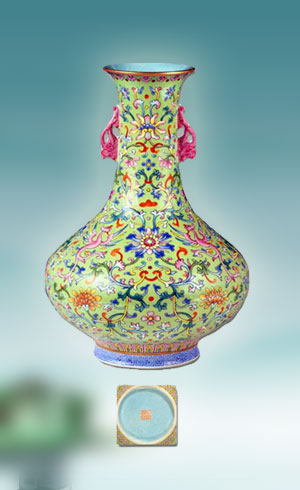 頸部貼朱雀形雙耳, 內(nèi)施湖綠釉,外翠綠釉上繪粉彩雙鳳穿花紋。底書“大清乾隆年制”六字礬紅篆書款。此瓶紋飾精細(xì),釉色鮮艷,較為罕見。