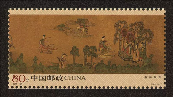 魏晉南北朝時(shí)期雖因大的社會(huì)變革而充滿了紛爭,但它的底色是浪漫的。這種浪漫流淌在嵇康奏出的《廣陵散》中,存在于劉勰《文心雕龍》的字里行間,隱藏在王羲之《蘭亭集序》的筆墨之下。而能將文學(xué)與繪畫之中的浪漫融合在一起的,當(dāng)屬一件傳說中的作品——《洛神賦圖》。說它是“傳說中”,因?yàn)槲覀冊缫褵o法看到《洛神賦圖》的真跡,原畫已經(jīng)散失在時(shí)間洪流之中,現(xiàn)存宋代摹本共有4種,分別被故宮博物院、遼寧省博物館和美國弗利爾美術(shù)館收藏。它是東晉畫家顧愷之根據(jù)三國詩人曹植的名篇《洛神賦》所繪制的一卷故事畫,描寫曹植與洛神之間的愛情故事,畫面還繪有車船、山水等景物及女媧、雷神等仙人。2005年9月28日,這卷充滿傳奇故事的畫卷被國家郵政局搬上了2005-25《洛神賦》(T)郵票。此套郵票是依據(jù)收藏在北京故宮博物院的《洛神賦圖》摹本進(jìn)行設(shè)計(jì)的,采用全套連印的形式,將全畫分成10部分,完整地再現(xiàn)了《洛神賦圖》的主要情節(jié)。巧妙的是,這套郵票同時(shí)把《洛神賦》全篇用楷書置于10枚郵票畫面中,又在全套郵票上方添加了介紹畫作的題跋,使郵票圖文并茂,也更加具有收藏價(jià)值。由曹植的《洛神賦》到顧愷之的《洛神賦圖》,是文學(xué)與繪畫的結(jié)合,由《洛神賦圖》到《洛神賦圖》郵票,則將這段千年前的浪漫故事與書信遙寄相思的作用融合在了一起,別有一番滋味。