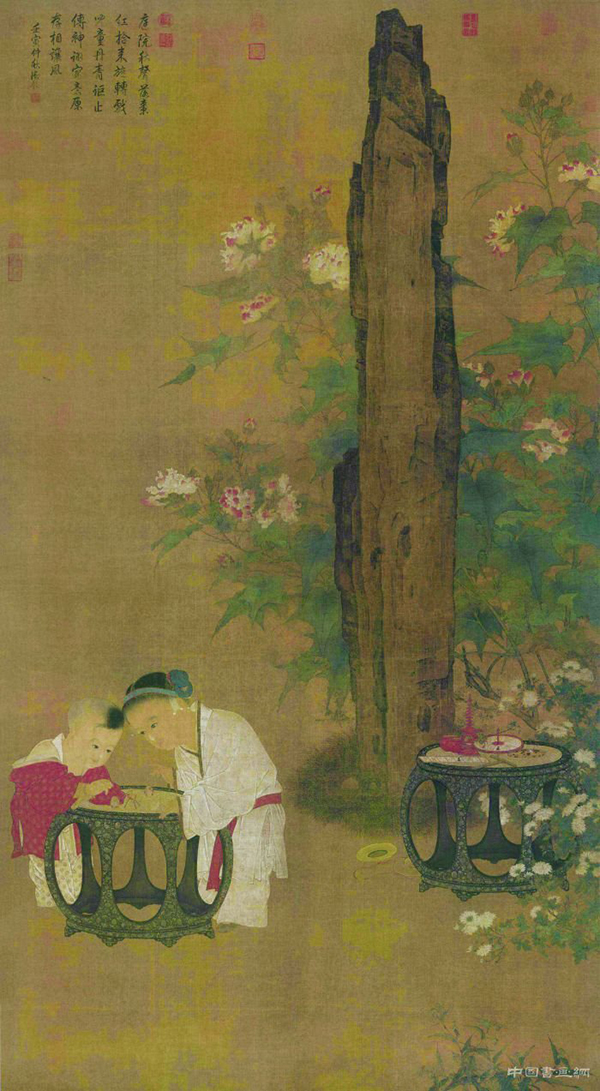 庭院深深深幾許,此刻,再高的院墻也擋不住帶著絲絲涼意的秋風(fēng)翻墻而至。假山兀自立在那兒,像是一位老者正在喜滋滋地看著孫子孫女玩游戲;高處大朵艷麗的芙蓉花與地處細(xì)碎潔白的菊花,影射著畫(huà)面的兩個(gè)主人公一大一小和諧天意之愿景;孩童的玩具、服飾、發(fā)型、首飾、家具,無(wú)不使觀者歷歷在目,大有如臨其境之感……