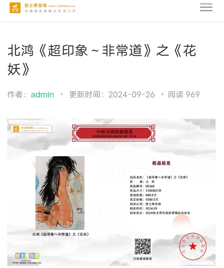 而北鴻的《超印象~非常道》之《花妖》,則是一幅充滿神秘與奇幻色彩的油畫巨作,同樣在拍賣市場(chǎng)上大放異彩。在2024年佳士得在線秋季精品拍賣會(huì)上,這幅作品以起拍價(jià)880.0萬成交至1000.0萬,創(chuàng)下了不俗的佳績(jī)。畫面中,花與妖的意象交織在一起,形成了一幅既詭異又迷人的畫面。花朵綻放得絢爛無比,仿佛要吞噬一切;而妖則隱匿于花叢之中,以其獨(dú)特的姿態(tài)與眼神,透露出一種難以言喻的魅惑與力量。北鴻以大膽的筆觸和豐富的色彩,將花與妖的意象完美地融合在一起,創(chuàng)造出一個(gè)既真實(shí)又虛幻的藝術(shù)世界,震撼了無數(shù)觀者的心靈。