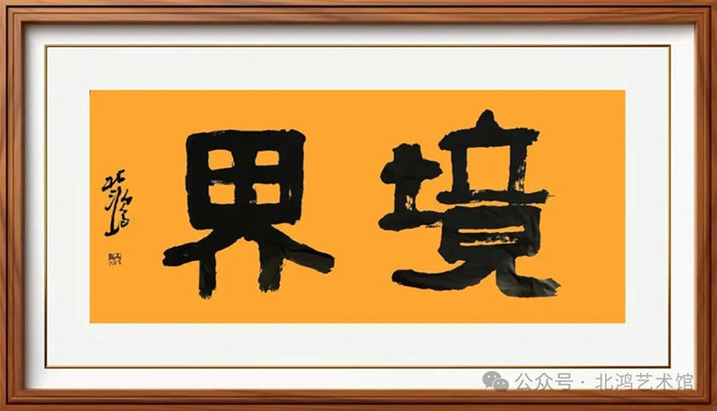 當(dāng)我們把目光投向北鴻所書的“境界”二字時(shí),首先映入眼簾的是那橙黃底色與濃墨字跡所形成的強(qiáng)烈視覺沖擊。這種色彩搭配,仿佛是特意為觀者開啟的一扇通往其內(nèi)心世界的大門,橙黃的底色如同陽光般熱烈,象征著北鴻內(nèi)心深處對(duì)藝術(shù)的熾熱追求,而那濃墨所書的文字,則是這追求所凝結(jié)而成的具象表現(xiàn)。