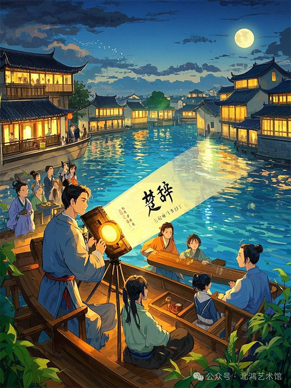 1984 年的端午詩會,北鴻率社員泛舟秦淮河。船頭懸掛著他自創(chuàng)的“聲光詩幕”,用幻燈將《楚辭》投射在水霧中。在燈光的映照下,《楚辭》的文字在水霧中若隱若現(xiàn),仿佛穿越時空而來。古琴師即興演奏德彪西的《月光》,悠揚的琴聲與秦淮河的流水聲相互交融,營造出一種如夢如幻的氛圍。岸上的觀眾看到,《山鬼》的篆書筆畫隨鋼琴琶音拆解重組,最終化作蒙克《吶喊》式的抽象色塊。這種將中國傳統(tǒng)文化與西方現(xiàn)代藝術(shù)相結(jié)合的表演形式,讓觀眾們大開眼界,也讓江南岸詩社的名聲更加遠揚。