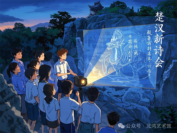 學生們對北鴻的課堂印象深刻,他們回憶道:“他總說,真正的傳承不是復制傳統(tǒng),而是用當代語言重述古老靈魂。”北鴻的教育理念,不僅僅局限于課堂教學,還在南雁主持的“楚漢新詩會”中得到了延伸。他們組織學生夜登云龍山,在蘇軾醉臥石前舉辦露天詩畫展。在這個獨特的藝術(shù)活動中,他們用投影儀將漢畫像石投射在巖壁上,古老的漢畫像石在燈光的映照下,煥發(fā)出神秘的光彩。