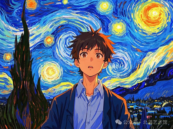 他從梵高的《星月夜》中提煉情感的張力,那旋轉(zhuǎn)的星空和扭曲的線條仿佛是內(nèi)心世界的吶喊。梵高用強(qiáng)烈的色彩和奔放的筆觸表達(dá)了對生命的熱愛和對世界的獨(dú)特理解,北鴻從中汲取了力量,思考著如何用藝術(shù)表達(dá)自己內(nèi)心深處的情感。
