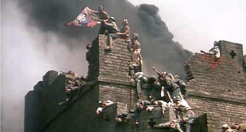 一天下午,拍攝影片末尾的一個長達2分多鐘的鏡頭:“劫后戰(zhàn)場”。地點選在一個直徑60多公尺、深10多公尺的大坑里。演員和道具布滿四周斜坡。攝影機在坑底中心位置,按照上、中、下3個高度搖3圈,拍成一幅長卷:空曠的原野上彈坑累累,車馬狼藉、硝煙縷縷,中國士兵和日軍士兵尸橫遍野,枯草上掛著殷紅的血滴……