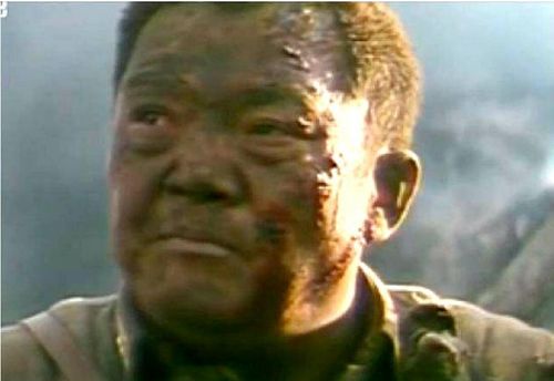 請看在徐州拍攝的臺兒莊車站一場戲。5名士兵從廢墟里蹣跚地走來。衣服襤褸,似有燒焦味。血污、灰塵把面孔涂得模糊不清,一名士兵炸斷了腿,被人攙扶著,一名士兵顫巍巍地向師長池峰城舉手敬禮——三根手指炸掉了半截,鮮血淋淋……細致而逼真的化妝效果,把戰(zhàn)爭的殘酷無情、中國士兵的英勇頑強,活脫脫展現(xiàn)出來。
