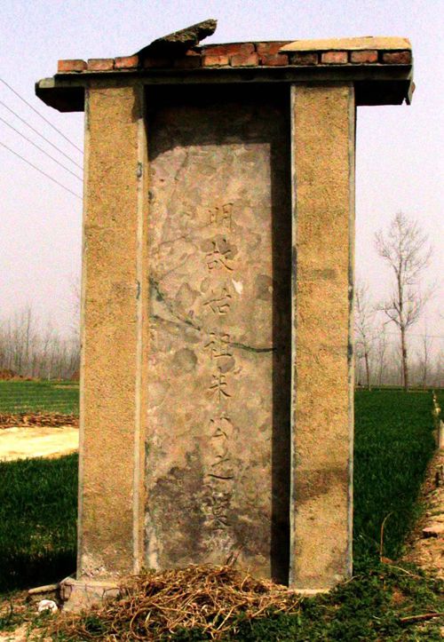 此時,一位老人從田頭拖著小板車從村外歸來,神態(tài)慈祥。筆者趨前詢問,此老竟是朱莊年齡最長的朱知修先生,已73歲。他帶我來到村北百余米處,青翠的麥田中豎立著一塊朱氏先人的古碑,上書“明故始祖朱公之墓”,系清同治九年三月所立。